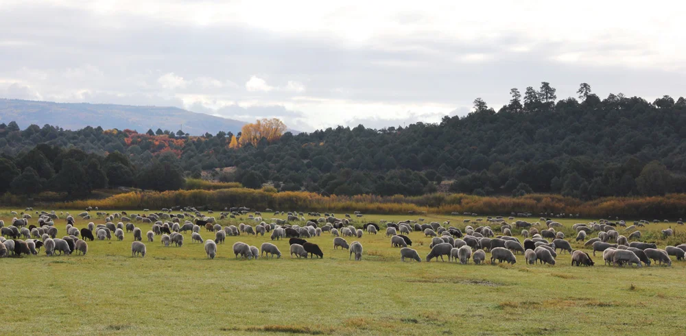 Unlike many factory-farmed animals, our lambs are never finished in a feedlot. Instead, they spend their entire lives browsing on the open range. In the spring, the flock eats shoots of wheat, grass and sand dropseed. Later, on the summer range in the Carson National Forest, the lambs eat plumajillo (yarrow), palo rosario (snowberry), Arizona fescue and mountain mahogany. Because sheep are browsers and not grazers, their diet is varied: they enjoy eating not only grass but also buds and many leaves, especially aspen.
